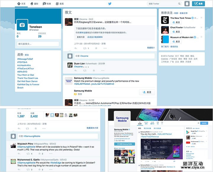 整体蓝色设计带来统一印象,颜色的深浅分别承载不同类型的内容信息,比如信息内容模块,白色底代表用户内容,浅蓝色底代表回复内容,更深一点的蓝色底代表可回复操作,颜色主导着信息层次,也保持了twitter的品牌形象。