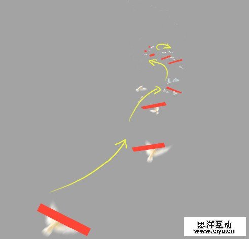 9。画到这里觉得近景的两朵云和远处地面上的各种建筑缺少了一种联系。同时这两者间也应该有着巨大的空间距离。怎么样把这种关联更好的表达出来呢?我想到可以增加一些飞鸟,由近到远,错落排列,从大小变化上可以看出空间远近的关系,曲线形的动势线也更有动感。