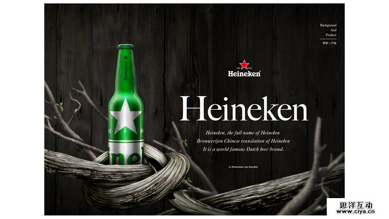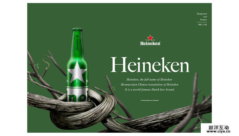 灰色调的绿作为纯颜色背景,主体是经过塑造的啤酒瓶,两者颜色虽然属于同一色系,
