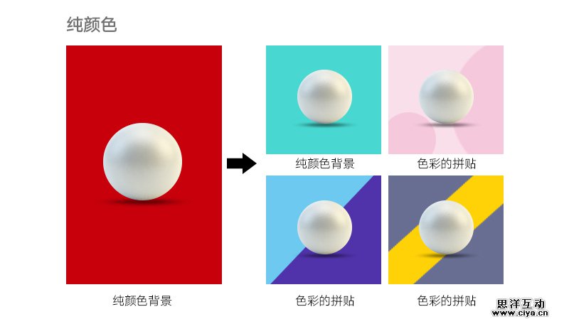 分别以纯颜色背景、场景背景、渐变背景、材质背景进行设计