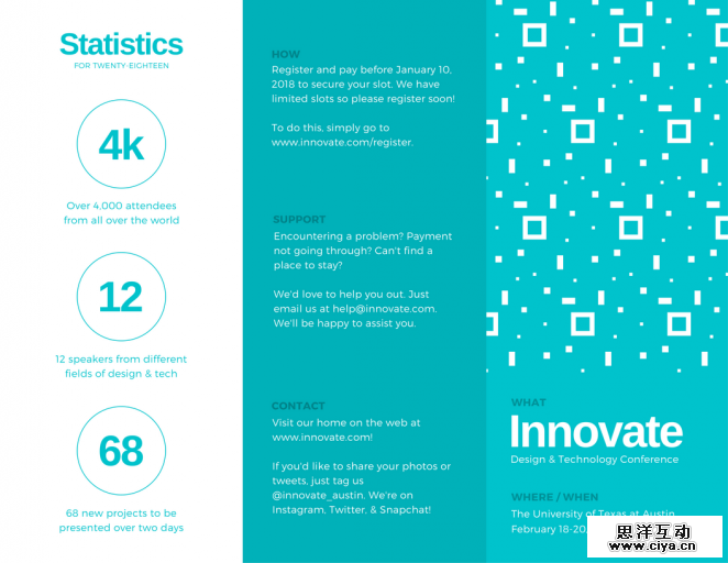 你的三折页并不一定都需要小或者整齐的文字,通过使用超大的设计元素形成对比,比如上图中的大数字,与常规尺寸的文字形成很大发差。