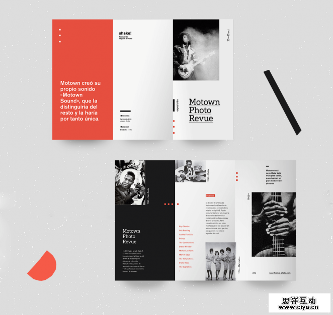 用巧妙的排版,精心策划的图像和复杂的设计元素设计一个现代感折页。用凝固的网格来陈述设计,你就可以得到一个可爱的三折页,就像上面的上面的Shake! R & B音乐节三折页一样。