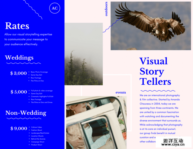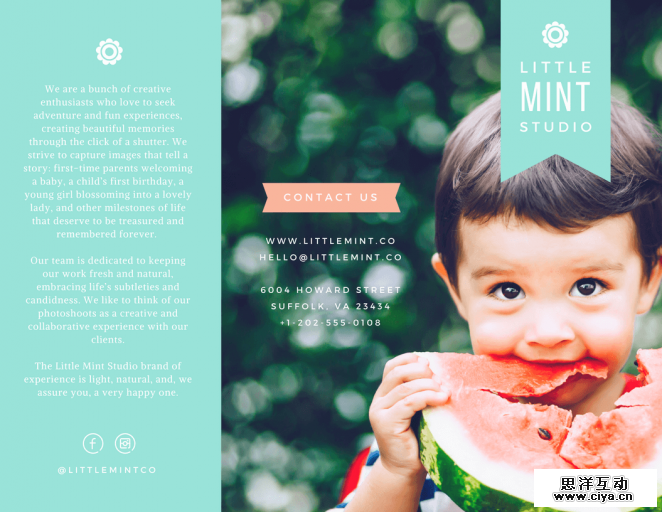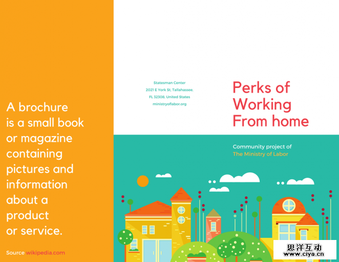 与传单和海报不同,宣传册可以更好地讲述你的品牌故事:你可以设计一个让人印象深刻的封面,附上你产品或服务的核心介绍,以及在结尾写上一条强有力的口号。