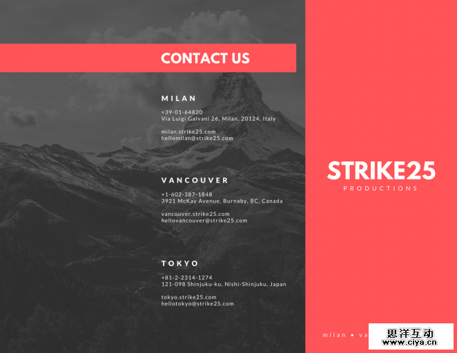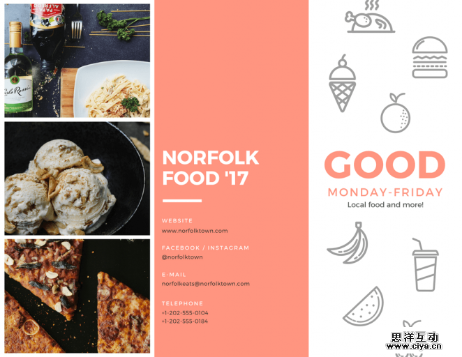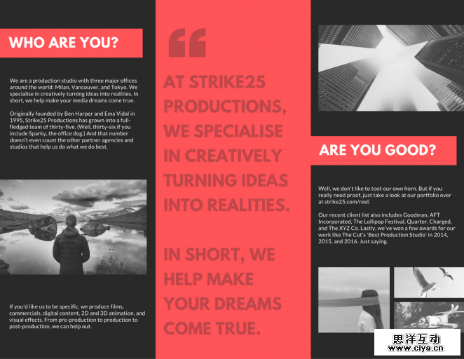 对于如何选取颜色初学者会很头疼,不要纠结配色或者颜色的含义,使用单一的颜色吧。选取一种颜色,使用它作为背景颜色,甚至用它作为滤镜的颜色处理图片,用来制作单色三折页。不是很买账?看看上面的事例就真的很棒,使用了单一的红色创建的三折页。