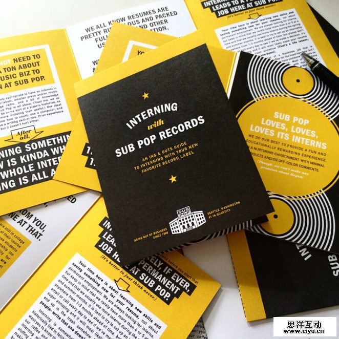 运用不同的配色方案,可以分离出若干内容,以及添加一些视觉上的趣味。上图中,设计师 Sasha Barr 交替使用黑、黄以及背景的白为Sub Pop 唱片实习招牌设计了一款酷酷的信息指南。