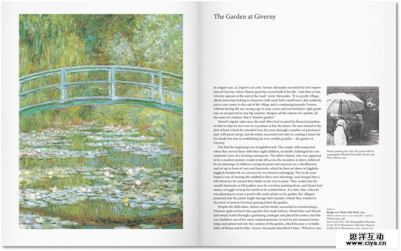 自1883年起,莫奈在吉维尼定居终老。那是个环境优美的地方,依山傍水,景色怡人,晚年好多作品在这里完成。他按照日本花园格局,耗费了几年在家中打造一个水上花园,池塘内种植了多个品种的睡莲。
