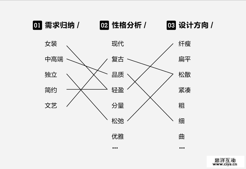 将整理出的需求关键词与字体的性格相对应,并对应匹配。是女性化还是男性化、是现代还是复古等等这些通过需求关键词便可以轻松对应到字体的性格中。