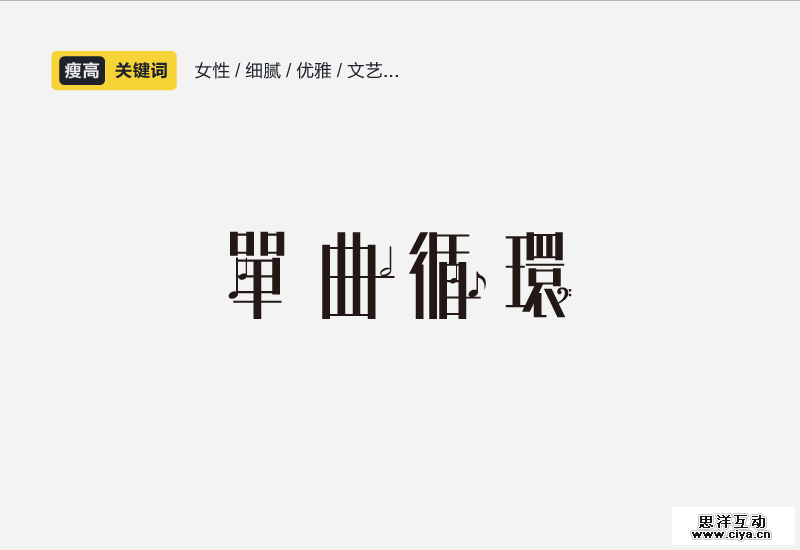 本案例虽然瘦高但也不算夸张,加一些图形点缀也是很有意思的。特别是表现女性色彩或者高冷文艺范的时候不妨试着把字体做的瘦高一些,当然笔画上可能就要适当的轻盈一些。