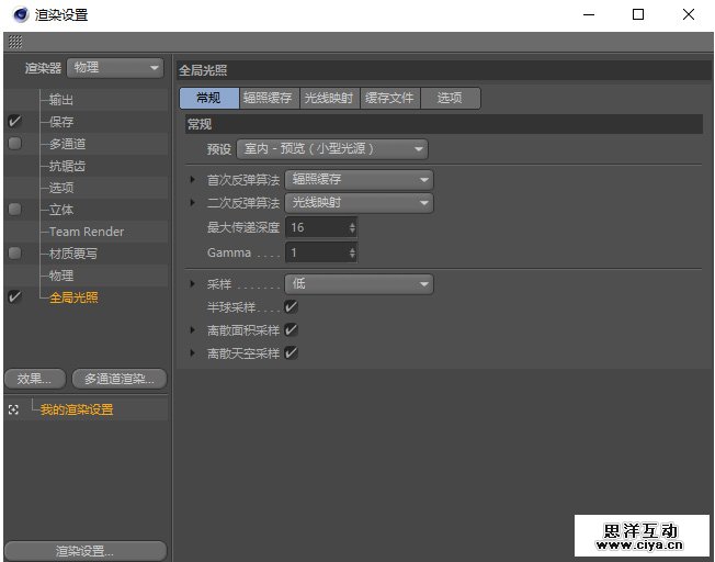 打开渲染设置,设置好输出的尺寸,然后再效果开启全局光照,并把全局光照的预设改为室内预览(小型光源),接着把渲染器改为物理渲染,物理把它的采样值提高接着点击渲染到图片查看器~~然后的然后就没有了,可以保存啦。