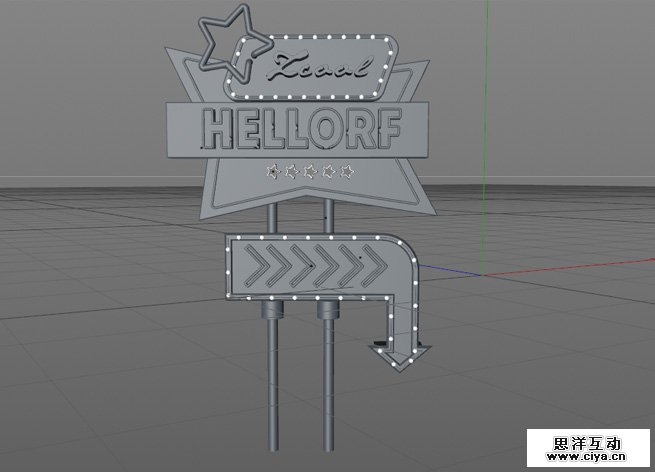 描给广告牌制作细节,记住花样条路径的时候还是要在正视图里面绘制才能更准确的对准位置。然后添加扫描与圆环,圆环与样条放入扫描的子集,注意下扫描对象圆环与样条的上下关系。