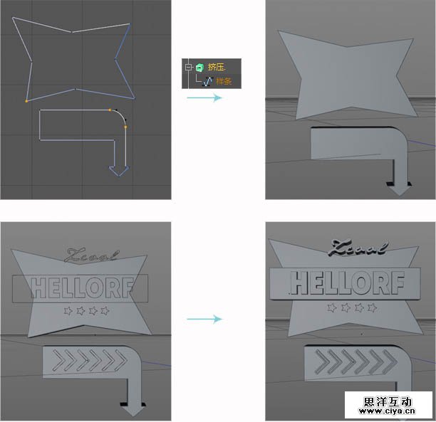 工具再正视图绘制广告牌外轮廓,使用挤压出厚度。请注意分批绘制样条,这样才能前后空间分割开来。制作步骤如下图,挤压的时候需要勾选上创建封顶,轮廓边才有光泽。