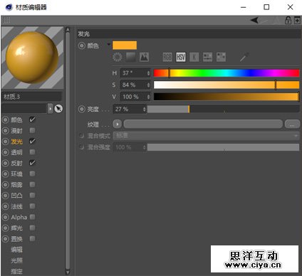 材质C:颜色通道设置一个黄色,并开启发光通道,这样渲染出来的的文字不会太过闷暗,发光通道把亮度修改为30左右。