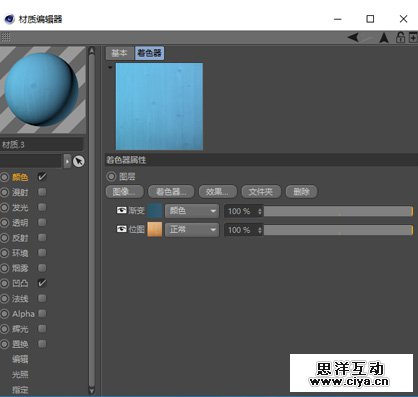 材质B:颜色通道纹理加载木纹图片,同时添加一个图层来改变这个木纹的颜色,着色器给一个深蓝色,混合方 式更改为颜色模式,让它混合出木纹肌理。