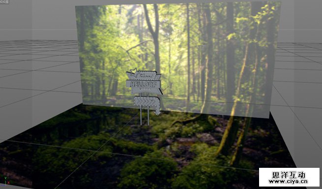 接着我们去给广告牌布光,布光的时候需要让主光源跟随图片背景的光源方向要一 致这样才能更真实的融入到场景当中。灯光开启投影(区域投影),以及灯光的衰减让灯光照射有强弱递增的变化,体积感才会更明显。做好主光源之后,再暗部区域添加一个辅助光,不要让投影太过黑暗。