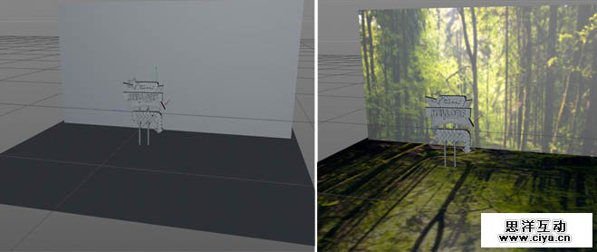 接着我们给广告牌添加两个圆柱,让广告牌立起来。圆柱调整下它的高度与半径即可,如下图,把两个广告牌串联起来。