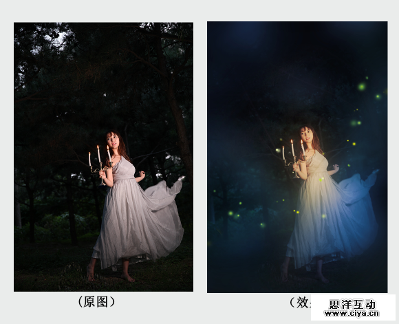 利用深蓝色制造夜景色再把画笔颜色更改为黄色制造出蜡烛光效。不要忘记画笔图层模式更改为【叠加】