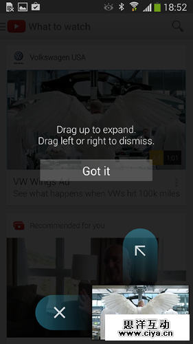 ·突出重点的提示。可以在安卓系统的YouTube 应用找到该类基于情境的提示。应用最将提示的数量压缩到最少,以将用户的注意力集中在一个、且优先级相对较高的操作上。它运用了遮罩的方式为用户解释那些不常见的交互行为,这些提醒仅在新用户第一次进入时出现,并且仅当用户首次进入应用的相关模块才显示,一次仅显示一个。