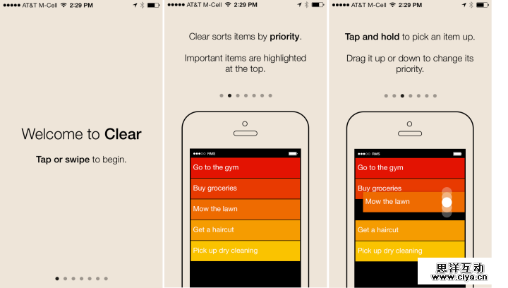 Clear, iOS系统上的一个任务记录应用,在用户开始使用应用前要用户阅读7个页面的引导