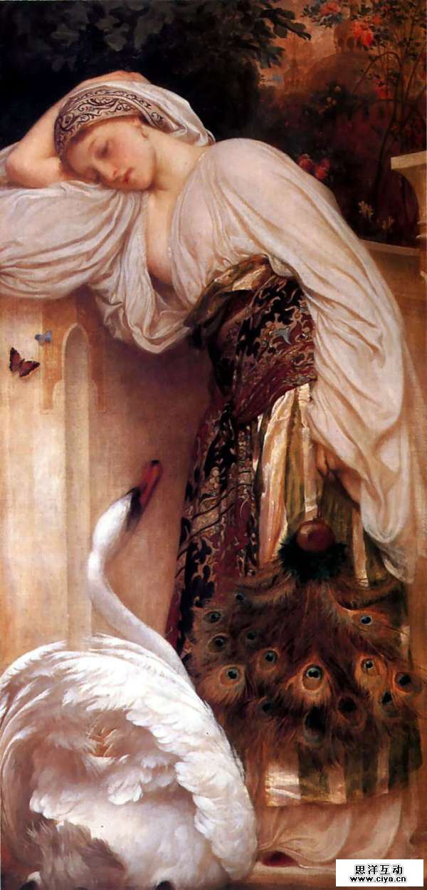 英国19世纪唯美主义画派最著名的画家弗雷德里克·莱顿,在英国绘画史上享誉极高。他非常热衷于古代神话、圣经的题材,追求恬静、和谐、典雅的样式。图1-1为其所绘的《侍女》,其内容也是表现的丽达与天鹅。