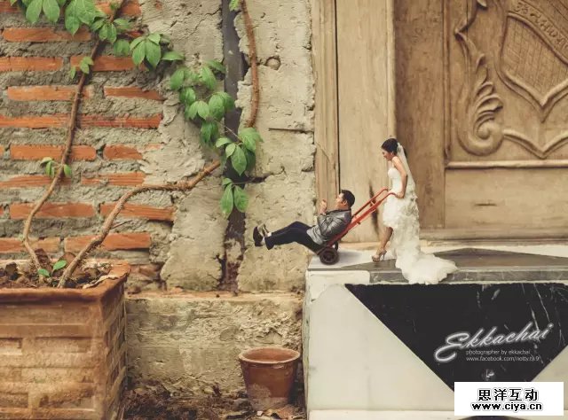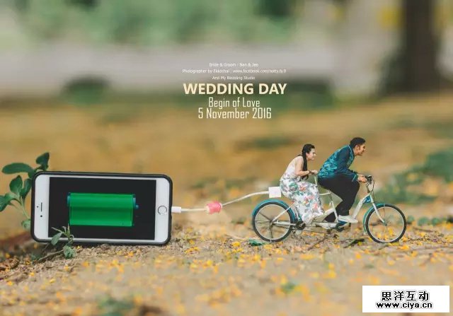 摄影+合成:之前看到过一组小人国的创意婚纱摄影,很有借鉴意义噢,比如可以故意放大商品,而把人物缩小,新颖有趣味。