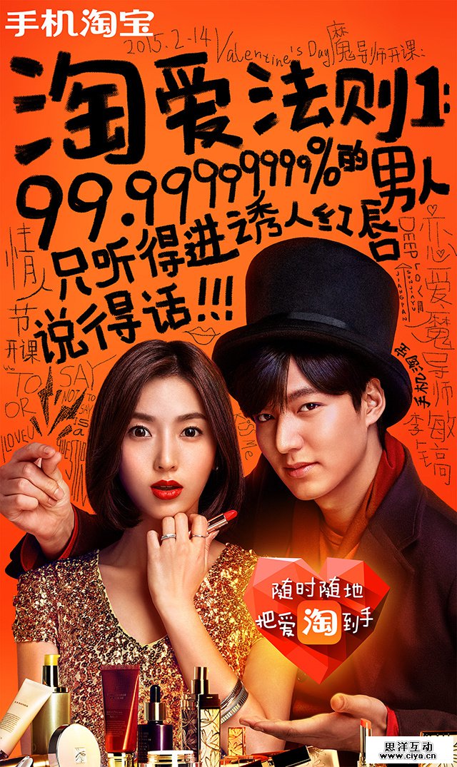 不过虽然都是针对年轻人群体,但可能是淘宝钱多资源多各方面都比较有条件的缘故,玩的花样也会多一些,下面这个应该是2015年的情人节海报。