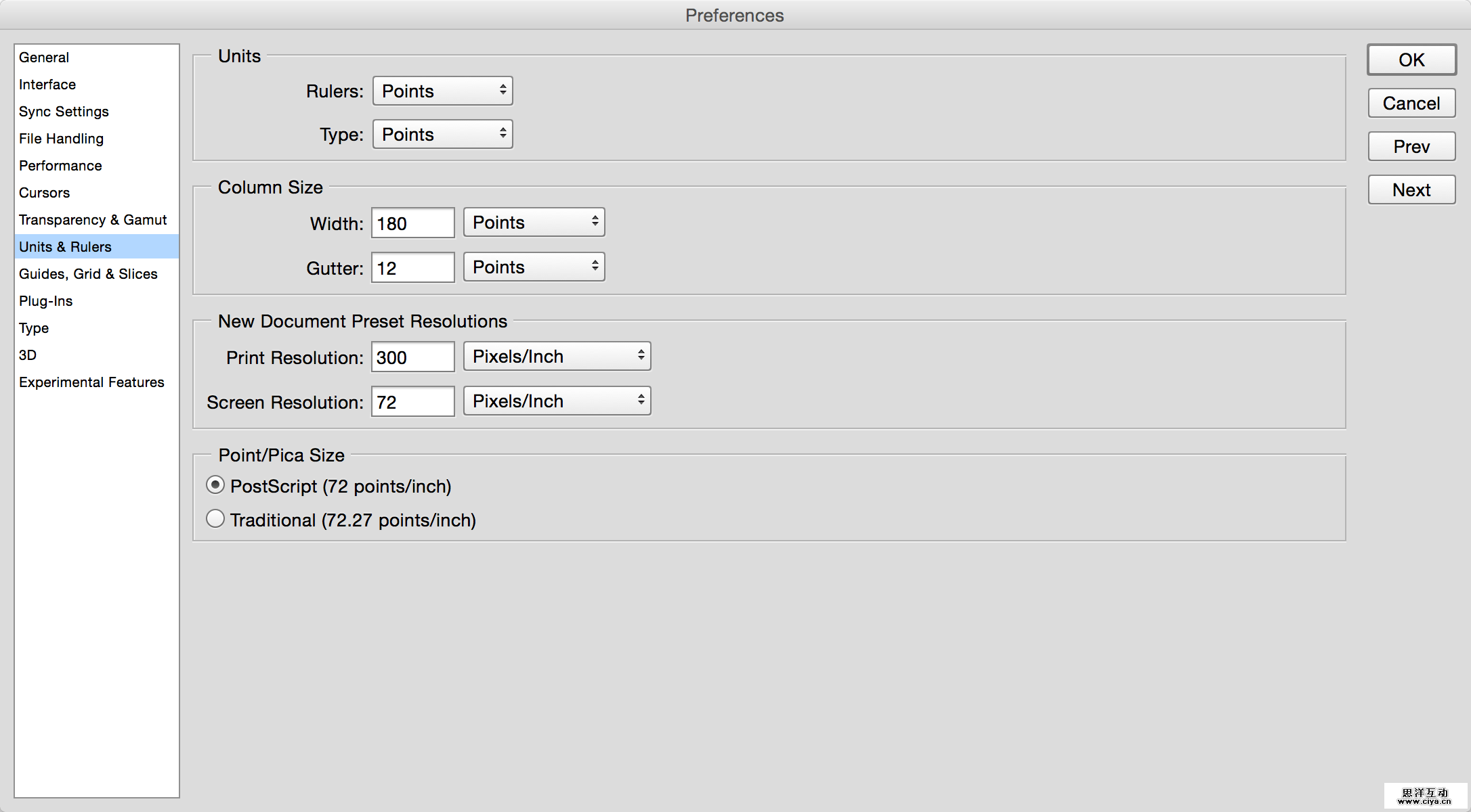 之前我说过,我们要以逻辑像素尺寸来思考界面。体现到设计过程中,就是要把单位设置成逻辑像素。打开PS的首选项——单位与标尺界面,把尺寸和文字单位都改成点(Point)。这里的点也就是pt,无论设计iOS、Android还是Web应用,单位都用它。当然,各平台单位名称还是要记住的。这里我们用的只是它的原理,不用在意名称。