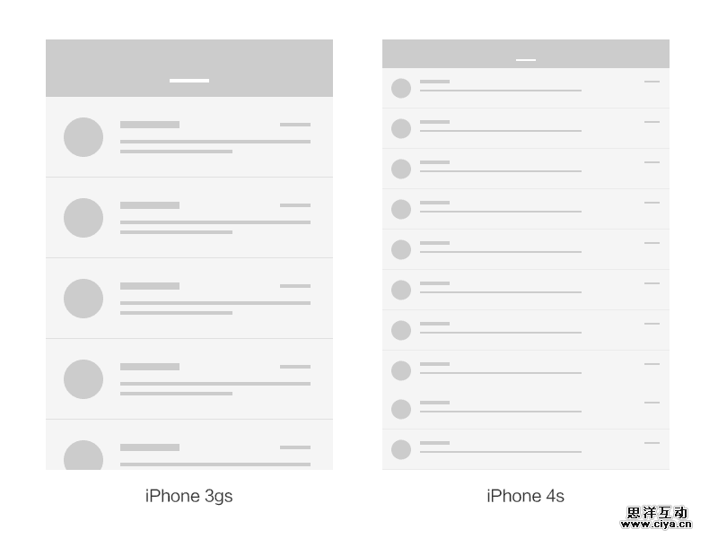 再用iPhone 3gs和4s来举例。假设有个邮件列表界面,我们不妨按照PC端网页设计的思维来想象。3gs上大概只能显示4-5行,4s就能显示9-10行,而且每行会变得特别宽。但两款手机其实是一样大的。如果照这种方式显示,3gs上刚刚好的效果,在4s上就会小到根本看不清字。
