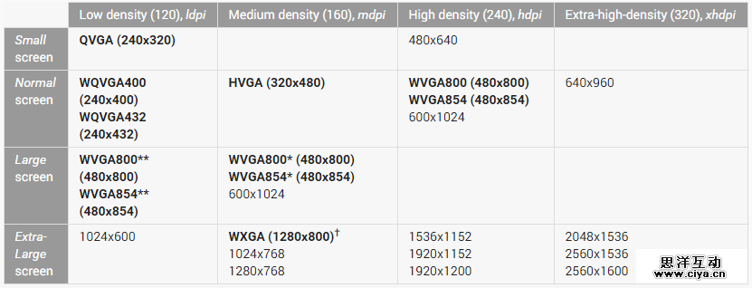 如图所示,像素密度在120左右的屏幕归为ldpi,160左右的归为mdpi,以此类推。这样,所有的Android屏幕都找到了自己的位置,并赋予了相应的倍率:
