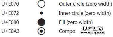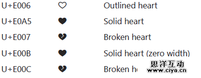 大部分此类字形在提供时其间距为零。你可以在每个零宽度字形上放置其他零宽度字形。例如,如果你插入零宽度的红色的实心 (U+E00B),光标不会跑到心形的末尾,因为其宽度为零。然后,如果你插入黑色的心形轮廓 (U+E006),则心形轮廓会放置在实心之上。