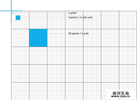 网格由单元和子单元组成。测量的基本单位就是单元。一个单元等于 20 × 20 像素。每个单元进一步细分为 5 × 5 像素的子单元。每个方形单元有 16 个子单元。下面这张图描述了屏幕左上角处的网格。放大该图像即可显示像素、子单元以及单元。