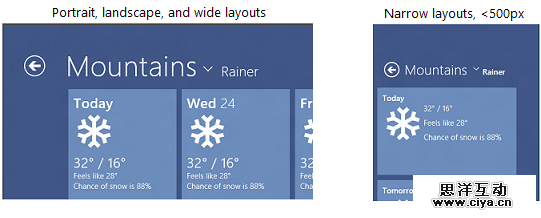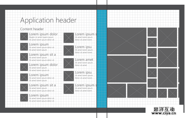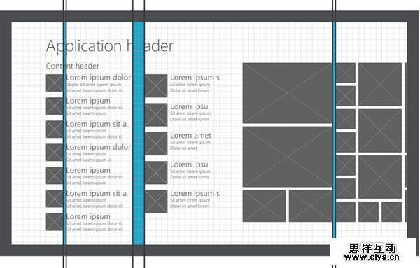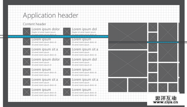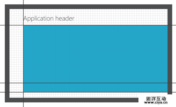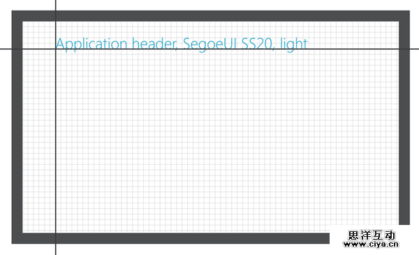 页眉的基线应该为距离顶部 5 个单元或 100 个像素。页眉的左边距为 6 个单元或 120 个像素。Windows 8 页眉为 Segoe UI 样式集 20 细线。