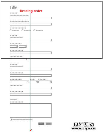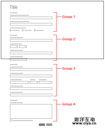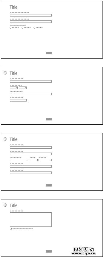 请不要尝试将大量内容置于一个非常长的表单中,而是考虑将任务分成多个组或多个表单序列。下面是分为多个组的较长表单示例(比如你设计的问卷,一长串连在一起,对方看到就觉得很多,看着不舒服,带来一种烦躁感。这不是 Modern UI 所提倡的,而应该简单化,有焦点。因此要分页):