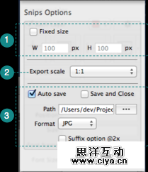 - 自动保存设置。建议勾选 auto save 和 save and close,这样会自动保存切片并关掉新建的切片窗口。Path 设置保存路径。Suffix option @2x 勾选后会自动在@2x切片的文件名加 @2x。