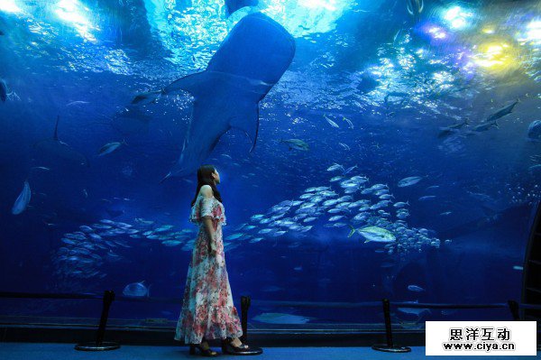 美之海水族馆的观察厅,我的对面是可以坐下来的观赏台阶,我把相机放在台阶上,设好后等待大鲸鲨游过来,再它快来的时候按下快门,站起来轻松地往那里一站拍下这张,估计只有水里的鱼看清了我在干什么吧。
