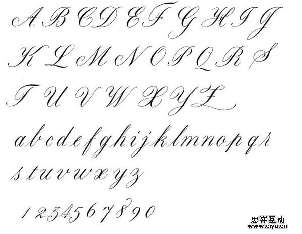 字母线条粗细分明,优美圆润,也是最常见的一种英文书法字体。恩,是国产山寨圆体英文字帖的原版。