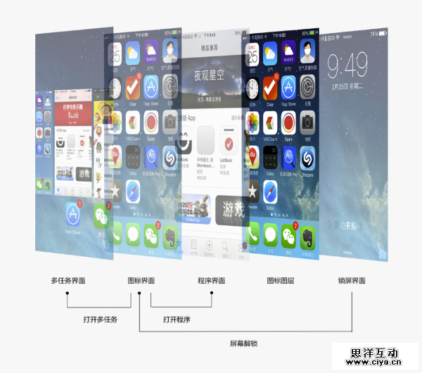 iOS 6(视觉表层&信息的外观)→ iOS 7(动效&信息的运作方式)