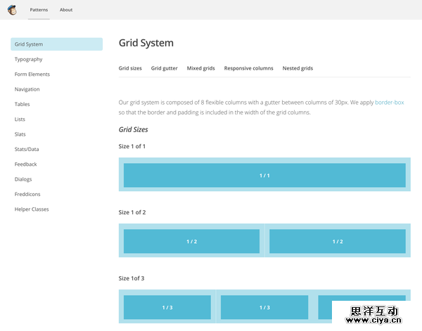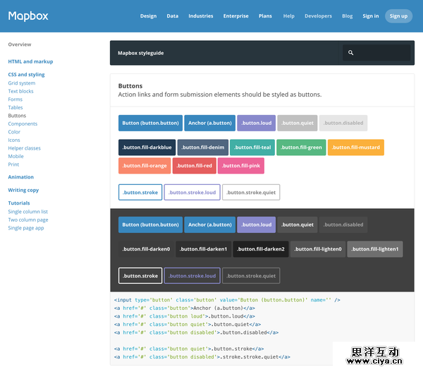 - 内容:对界面元素(UI Elements)的样式风格及实现其效果所对应的代码片段(HTML, CSS)作出说明解释,包含交互和动效设计(以 JavaScript 为主)。例如:常见的基础布局(Grid System)、字体排版(Typography)、按钮、菜单、列表、对话框(Dialog)、Tooltip 等等。