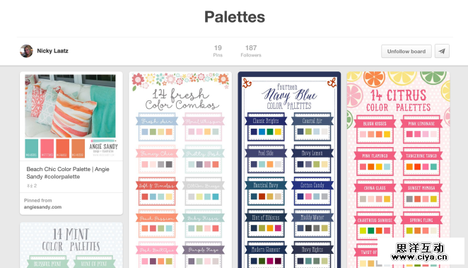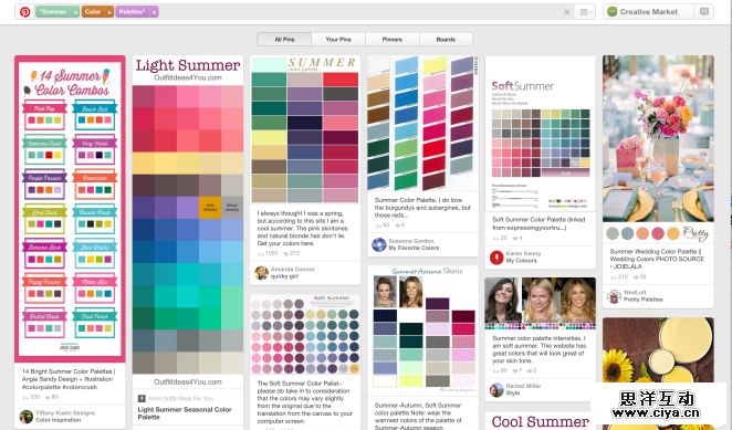 “很简单,如果我正打算做一个海滩主题的海报,那么我通常只需要搜索‘Summer Color Palettes’,然后在搜索结果中挑选一个中意的就好了。 ”