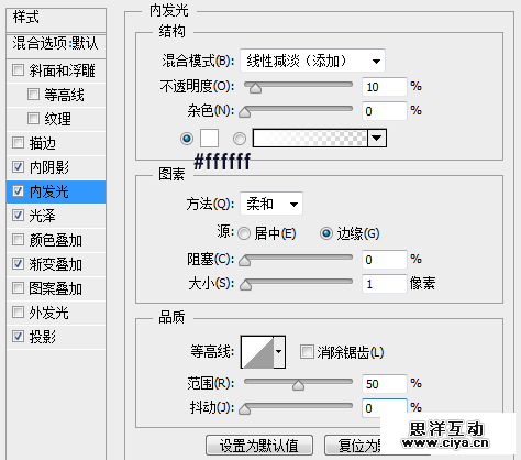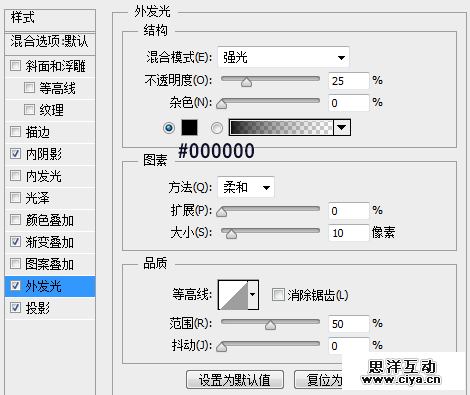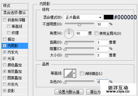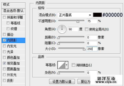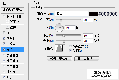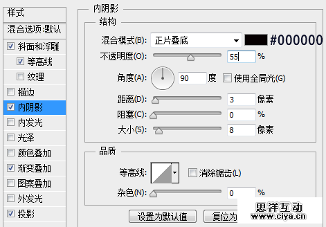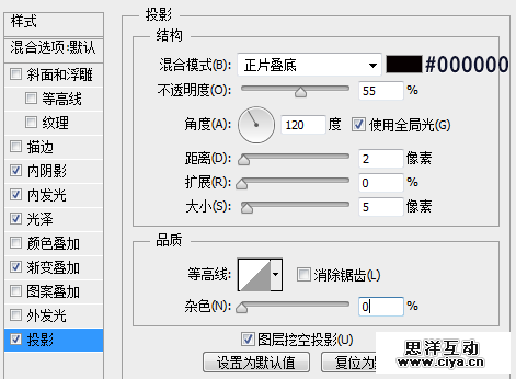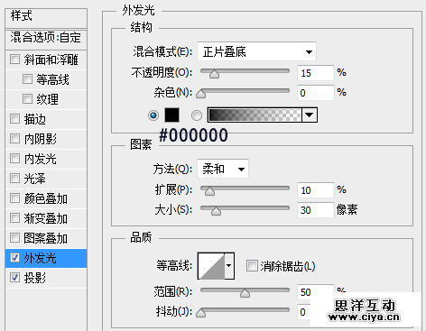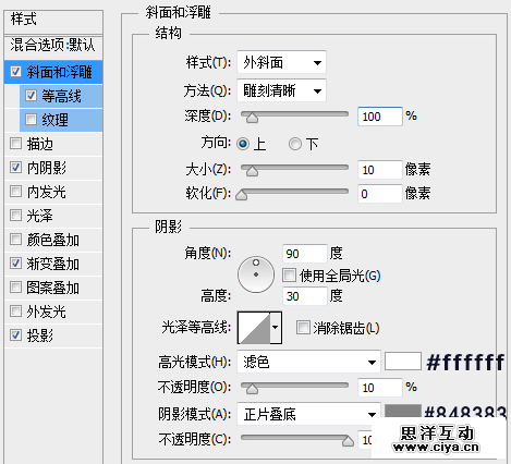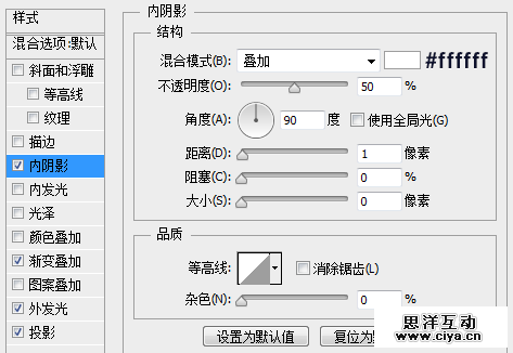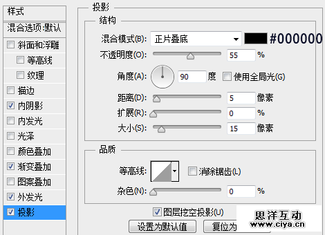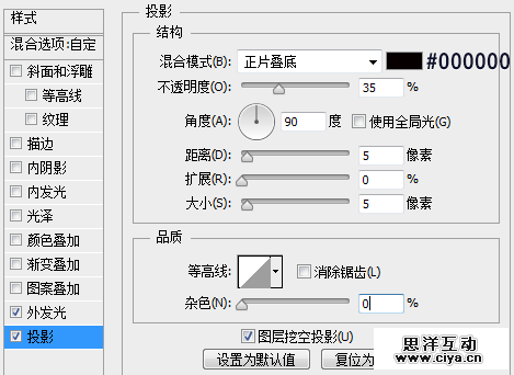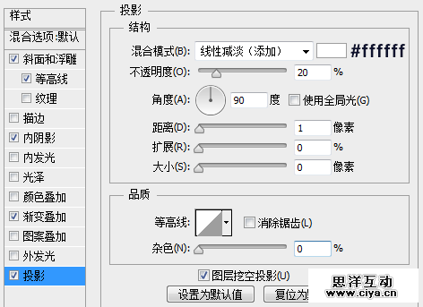 现在轮廓外形已基本呈现,但是质感略嫌不足,我们来改进一下。复制一层“外形”图层,将其更改名为“轮廓投影”,并将其置于“外形”图层下层,清除其图层样式,将填充更改为0,重新设置一个图层样式,设置如下: