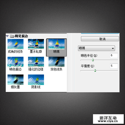 执行“滤镜—滤镜库—画笔描边—喷溅”,设置喷色半径为6,平滑度为5
