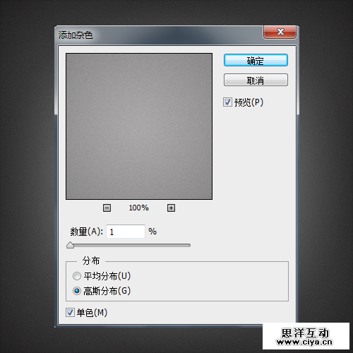 下面,我们为背景图层添加一个杂色。 执行“滤镜—杂色—添加杂色”,设置数量为“1%”,高斯分布,勾选单色。