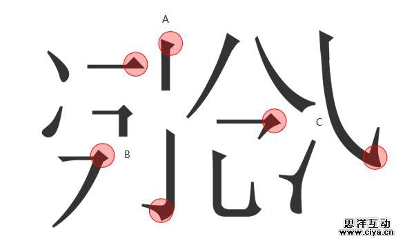 宋体衬线特征了解后,我们会发现其实衬线字体笔画很多地方装饰性元素有共性,但有些还是有个性变化的。所以我们在做不同主题的字体的时候可以根据字体特征一般在笔画的开始位置(A)、拐角(B)或是末端(C)添加装饰性元素和设计(如上图),让字体显得更加个性,更有设计感。