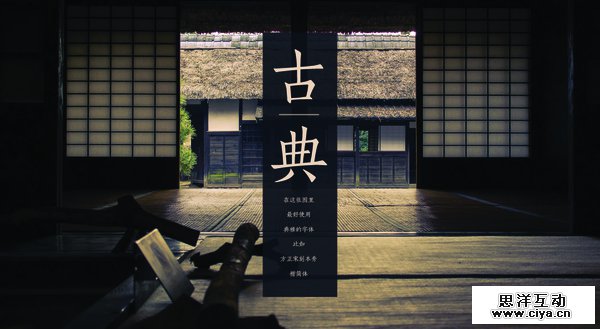 第一个例子,由于照片的色组属性是“强烈”、“突出”和“单调”,所以选用了细笔画的古典字体,这是一个“文字粉饰图片”的例子。