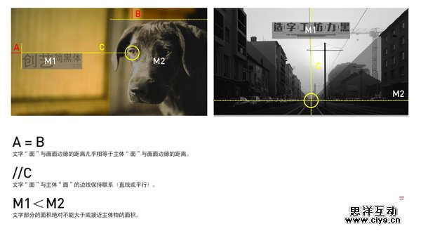 上图是说明我并不凭感觉去确定文字部分的位置,仅仅只是按照三大原则来确定的。在左图中,小狗虽然是照片里的主体物,但是因为眼睛的存在,所以文字的排版必须依照视觉焦点(眼睛)来排版,这是之前D组结论提到过的。但是在计算字体部分与画面边缘的距离的时候,依然参照与主体物与边缘的距离,而非视觉焦点与边缘的。