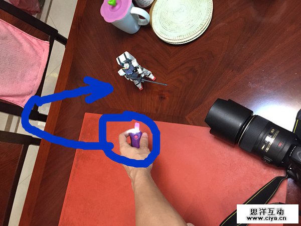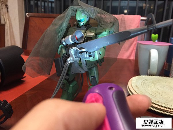 ok,我们要先拿条红色毛巾挂在高达后面不远处,然后,以红色毛巾为光源,从那个方向放个小电筒照着高达模型。