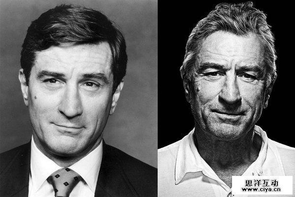 通过上面一组男女神不同年龄段的对比我们可以看到,衰老在肖像上主要体现在皮肤松弛、发际线后移、毛发稀疏掉色上——这就是我们的切入点。