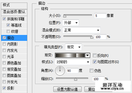 设置一个5像素大小的外部渐变描边,描边的渐变这里不再标注颜色了,我导出了一个渐变,各位直接在素材包中找到“stove pipe 80.grd”这个渐变,导入PS中并应用就可以了。