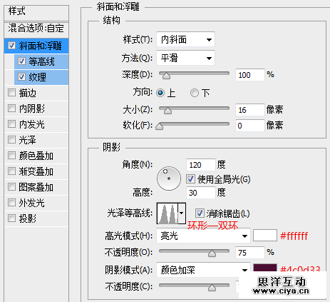 接下来,我们给“圆形3”图层添加一个图层样式。首先,我们添加一个“斜面和浮雕”。这里的光泽等高线设置为“环形”。