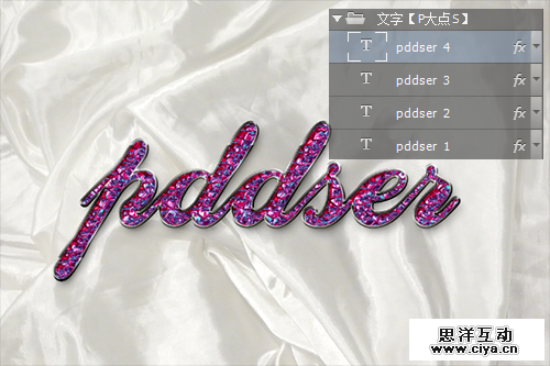 我们复制pddser文字图层三层,并给其重命名,以pddser 1 2 3 4 命名,方便等会更为直观的观看教程,原作者用的CC2015,图层样式强大过低版本的这些好多,考虑到也许现在用CC2015的人并不会太多,我们修改了原作者的做法。选择住四个文字图层,CTRL+G创建一个图层组,将pddser 2 3 4三个文字图层的填充设置为0。