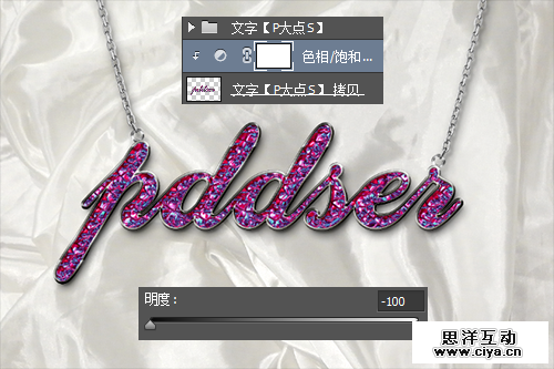 我们拷贝一层文字图层组,置于文字图层组的下方,合并组,并添加一个“色相/饱和度”调整层,将明度调整为-100,创建剪贴蒙版,让文字成为黑色。